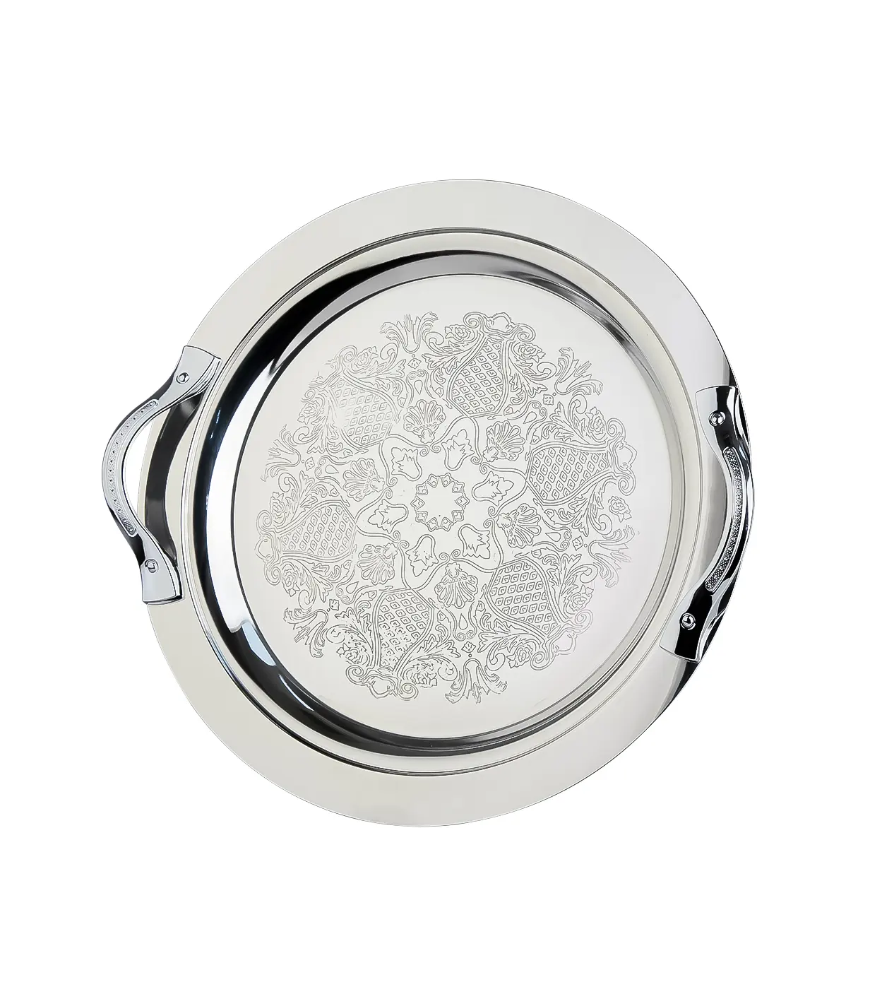 کف سینی دارای طرح زیبای حکشده است که جلوهای لوکس و چشمنواز ایجاد میکند و در عین حال مانع از لغزش ظروف روی سطح آن میشود. طراحی گرد و هماهنگ آن، چیدمان فنجان، لیوان یا خوراکیها را آسانتر کرده و نمایی منظم و دلنشین به پذیرایی شما میدهد.